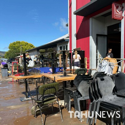 An hour's drive from Ōnuku, recovery efforts began in Wairewa (Little River) earlier today, with residents cleaning their yards after local flooding took to the main road and surrounded many homes.